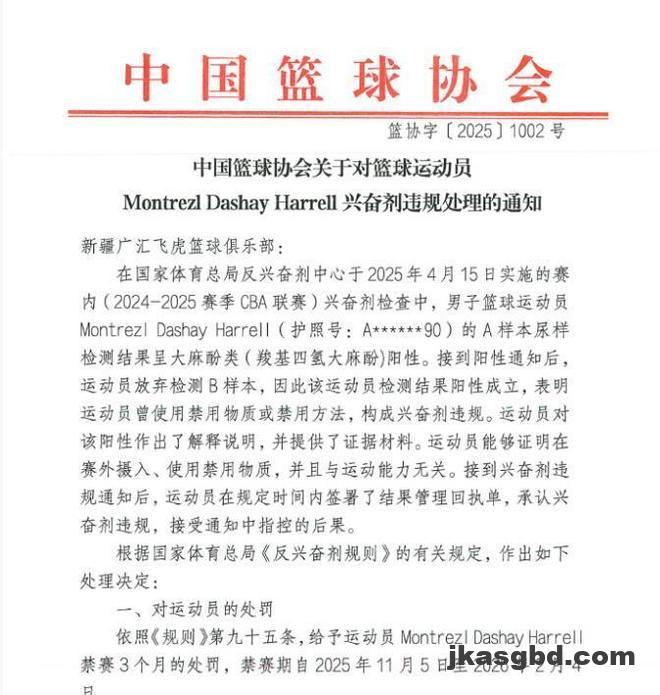 11月6日,篮协公布对上赛季新疆队外援哈雷尔的处罚,由于兴奋剂违规问题,哈雷尔被CBA处禁赛3个月,时间是2025年11月5日至2026年2月4日。球队方面,新疆队需要承担20例兴奋剂检测的费用36000元;对于新疆队的队医、医疗与反兴奋剂负责人吴杰警告处分。