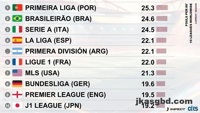 当地时间10月13日,瑞士足球天文台统计了各国联赛每90分钟的犯规情况,其中葡超以25.3次犯规位居榜首,巴甲以24.6次位列第二,意甲以24.5次位列第三。