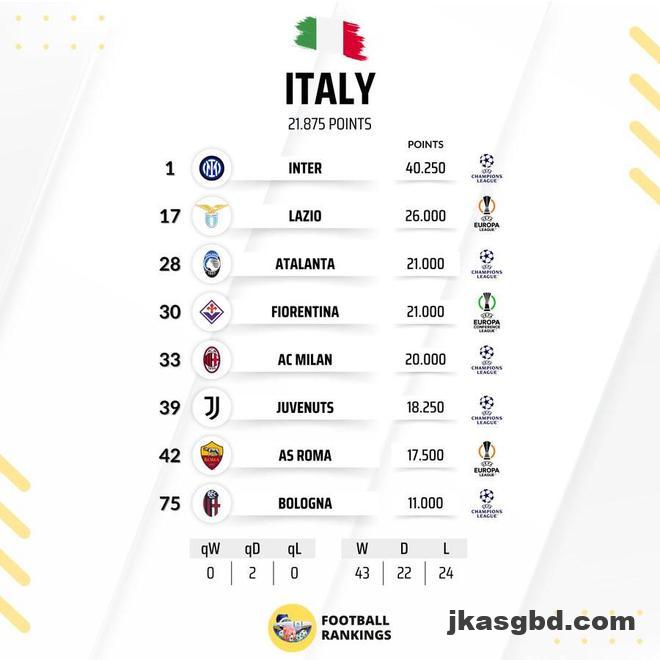 北京时间6月6日,数据机构 Football Rankings 公布了2024/25赛季意大利俱乐部在欧洲赛场的欧战积分排名。国际米兰以40.250分高居欧洲俱乐部榜首,AC米兰排名第33,尤文图斯排名第39。