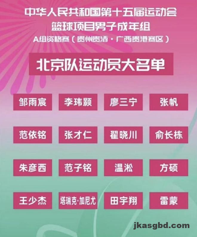 北京时间5月28日,北京队公布了第十五届全运会篮球项目男子成年组的16人大名单,效力于北京男篮的翟晓川、范子铭,效力于北控男篮的廖三宁、张帆在列。