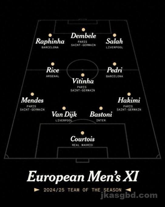 直播吧5月21日讯 日前,TA评选了本赛季欧洲最佳阵容,巴黎4人入选,拉菲尼亚在列、亚马尔落选。 门将:库尔图 […]