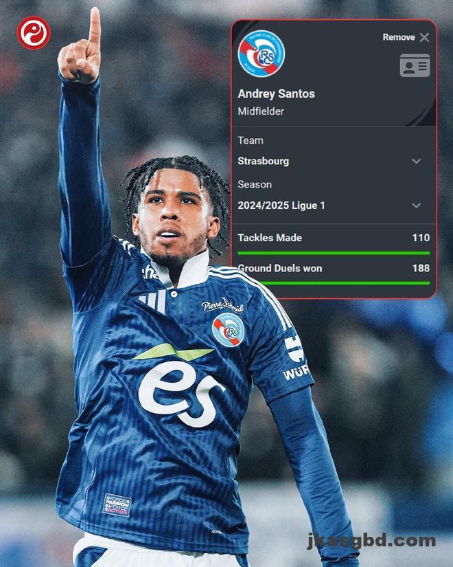 在2024/25赛季法甲联赛中,斯特拉斯堡中场安德雷-桑托斯的数据表现相当亮眼。根据数据媒体 Squawka 的统计,他在本赛季共赢下了188次地面对抗和完成110次抢断,这两项数据在所有法甲球员中排名第一。