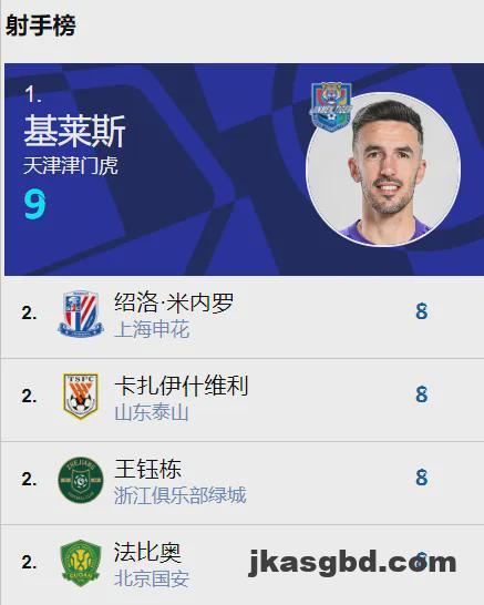 中超前13轮比赛战罢,上海申花在积分榜上确立了2分的领先优势,成都蓉城、北京国安紧随其后。而在射手榜上,津门虎外援基莱斯在经历了4轮的进球荒之后,最近3轮比赛连进2球,再度甩开身后众人以9粒进球的成绩领跑中超射手榜。不过,基莱斯可不敢再有怠慢,身后的米内罗、瓦科、王钰栋和法比奥都有8粒进球,他们随时可以追平甚至反超自己。