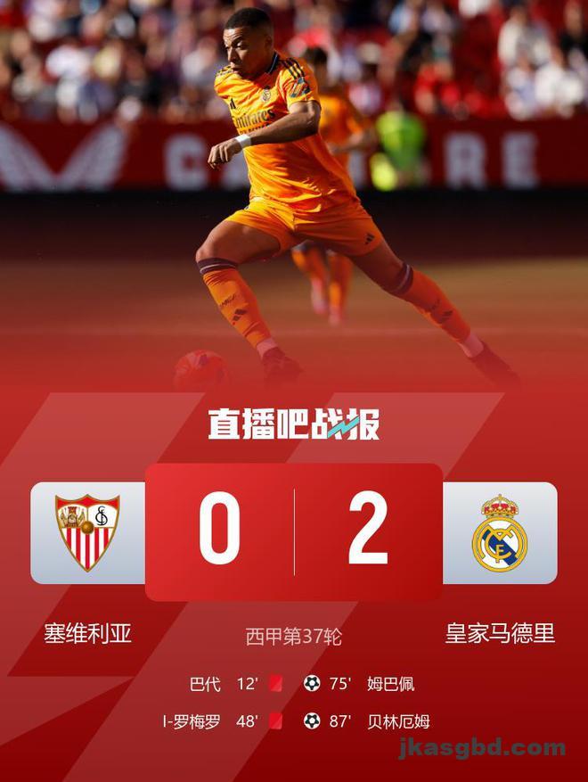 直播吧5月19日讯 北京时间5月19日凌晨1时,西甲第37轮,皇马做客皮斯胡安球场对阵塞维利亚。上半场,姆巴佩前插突破制造了巴代的红牌,随后姆巴佩错失一次单刀良机。皇马半场0-0战平塞维利亚。下半场,伊萨克-罗梅罗铲抢犯规也被直红罚下,随后姆巴佩首开纪录,连续5场比赛都收获进球,贝林厄姆扩大领先优势。最终皇马2-0击败塞维利亚。