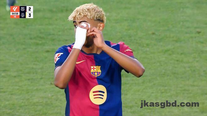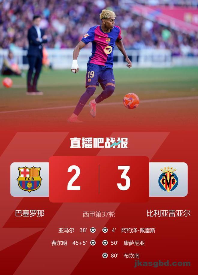 直播吧5月19日讯 北京时间5月19日01:00,西甲联赛第37轮巴萨迎战比利亚雷亚尔的比赛在诺坎普球场进行,上半场阿约泽闪击破门,亚马尔连场精彩兜射扳平比分,费尔明抽射建功反超,下半场康萨尼亚挑射扳平比分,布坎南抽射反超,最终巴萨2-3比利亚雷亚尔联赛六连胜终结,黄潜锁定下赛季欧冠资格。
