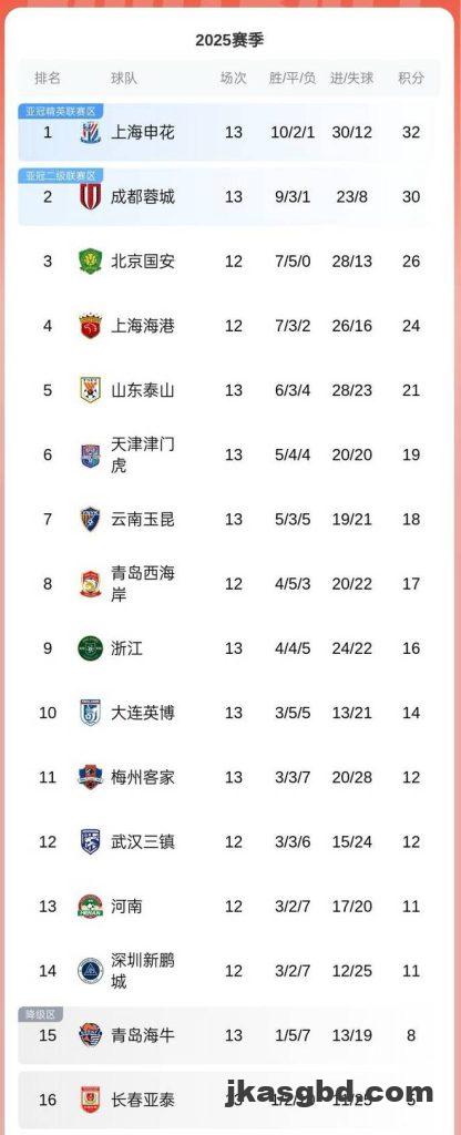 闪电体育5月17日讯5月17日,中超第13轮,除新鹏城vs三镇延期外,其余场次均战罢。最新积分榜已经更新,申花获胜2分领跑,十人蓉城战平西海岸位列第2,国安遭海牛补时绝平落后榜首6分位列第3,海港战平泰山,两队相差3分仍位列4、5名。