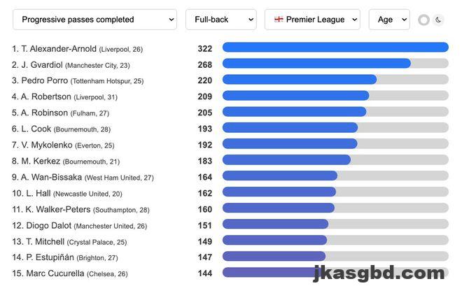 DataMB网站统计了英超边后卫向前传球完成数:阿诺德以322次居榜首,格瓦迪奥尔268次第二,波罗220次第三。