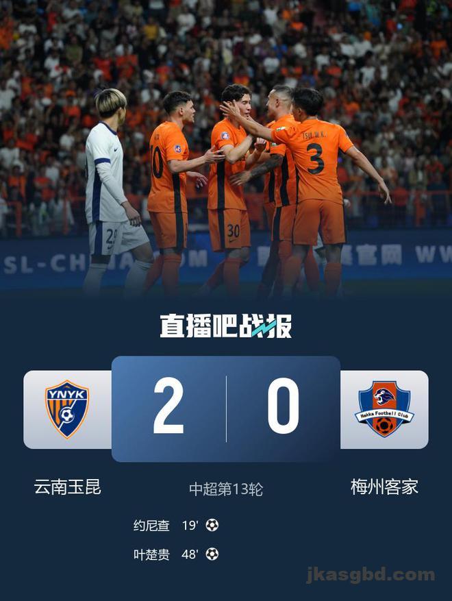 直播吧5月16日讯 北京时间5月16日19:35,中超联赛第13轮云南玉昆迎战梅州客家的比赛在玉溪高原体育中心进行,上半场内内助攻约尼查低射首开记录,茹子楠抽射造险,半场结束,云南玉昆1-0梅州客家。下半场叶楚贵补射扩大比分,最终云南玉昆2-0梅州客家豪取三连胜积18分暂升第6,梅州四连败积12分仍居第11。