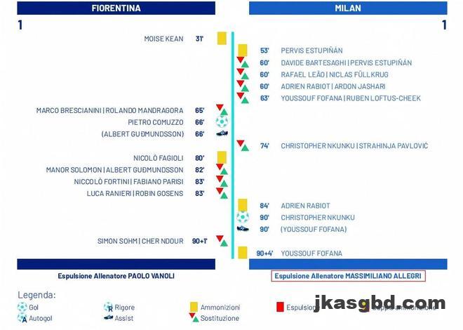米兰在意甲第20轮客场1-1战平佛罗伦萨,赛后的裁判报告显示主教练阿莱格里在这场比赛当中还被裁判驱逐出场。