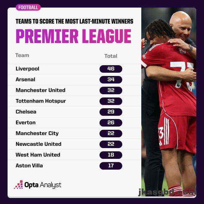 北京时间8月27日,数据机构Opta公布了一项统计数据:自英超创立以来,利物浦共打进46粒读秒绝杀进球,位列英超历史第一。