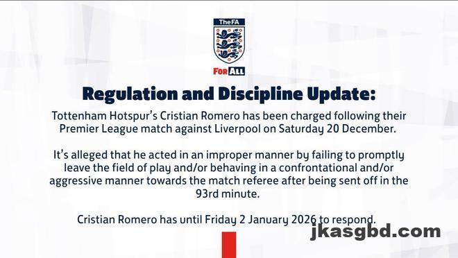 北京时间12月25日凌晨,英足总官方发布公告,宣布对罗梅罗提出指控。