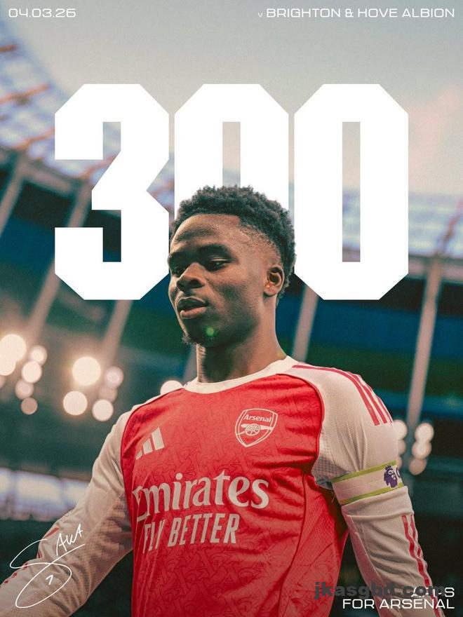英超第29轮,阿森纳客场对阵布莱顿,萨卡作为队长首发出战,迎来阿森纳一线队生涯第300次出场的里程碑之战。