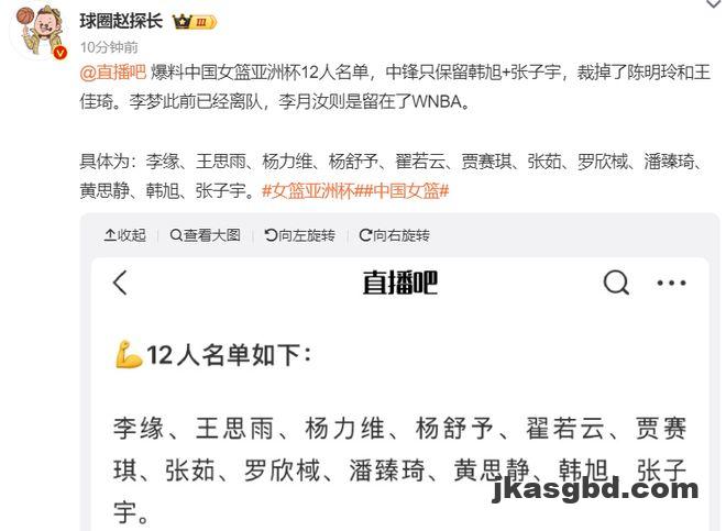 北京时间7月12日,根据媒体直播吧的报道,中国女篮亚洲杯的12人名单已经确定,最终裁掉了陈明伶、王佳琦,中锋位置上只留下了韩旭、张子宇。