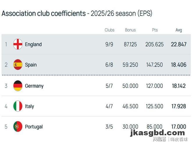 除了英超之外,西甲、德甲和意甲分别排在第二名到第四名,首尾差距不到0.5分,只要比其他联赛多一队晋级下一个阶段,就能抹平这个差距。谁能获得另外一个欧冠奖励名额,还是有些悬念的,三大联赛将会为前两名展开激烈的争夺。