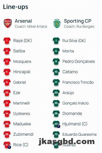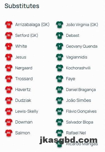 替补:13-凯帕、35-汤米-塞特福德、4-本-怀特、9-热苏斯、16-内尔高、29-哈弗茨、39-哈里森-杜齐亚克、49-刘易斯-斯凯利、56-道曼、89-马利-萨蒙