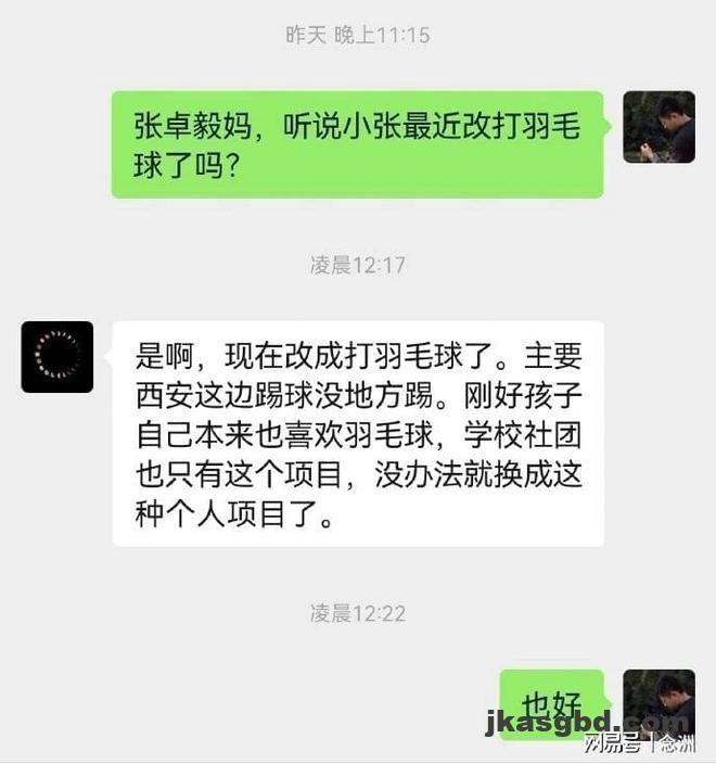 然而据10号沛沛最新透露,张卓毅的家长明确表示,孩子已经改打羽毛球了,主要是因为西安这边踢球没地方踢。刚好孩子自己本来也喜欢羽毛球,学校社团也只有这个项目,没办法就换成这种个人项目了。