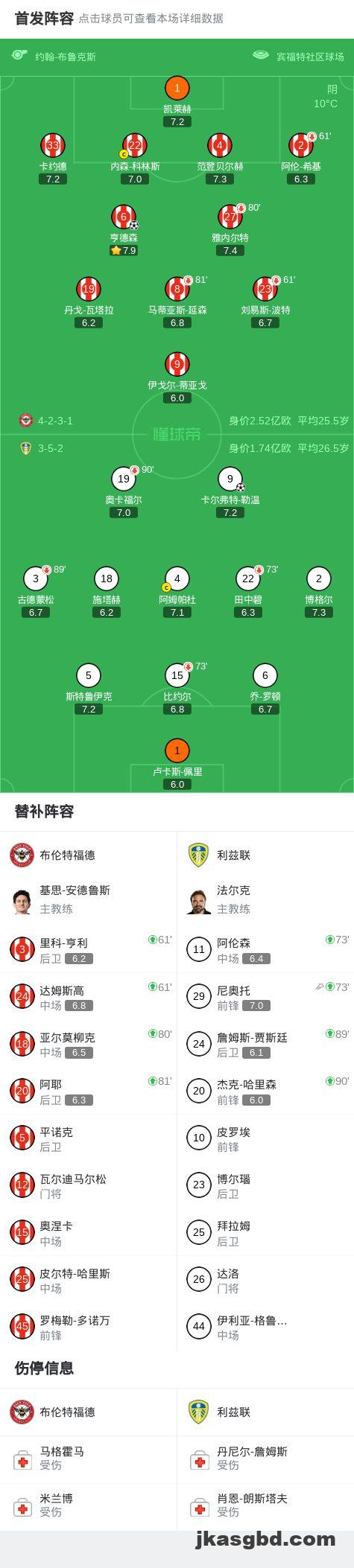 第70分钟,亨德森禁区内折射破门,布伦特福德1-0利兹联