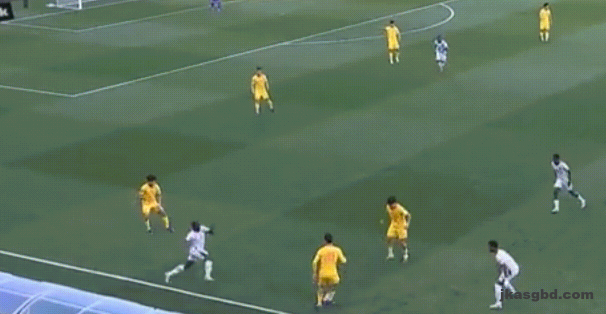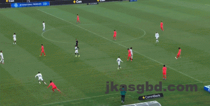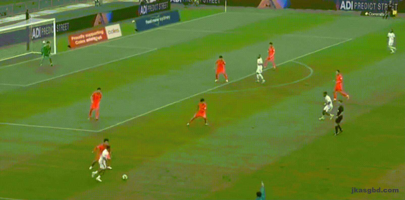 张玉宁不仅在空中完全占据优势,在地面拿球时库拉索的后卫也是对他毫无办法。这次张玉宁接到队友的界外球,禁区线左侧背身拿球,转身扛开后卫冲入禁区,变向晃开角度之后倒三角传中,可惜没有队友跟进,错失了一次非常不错的进攻机会。