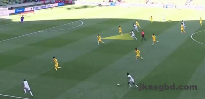 作为三中卫靠右的吾米提江在第一个丢球中暴露了他转身慢的弱点,喀麦隆前锋永乔在离吾米提江还有2-3个身位时向禁区加速冲刺,最后竟然将吾米提江压制在了自己的身后,此外刘浩帆也没有第一时间启动跟上他,埃永正是利用永乔创造出来的空间攻破了国足的球门。