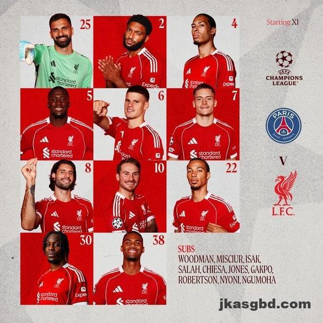 此役客场对阵巴黎圣日耳曼,萨拉赫替补待命,范戴克、科纳特、乔-戈麦斯、凯尔凯兹和弗林蓬五名后卫首发出战。
