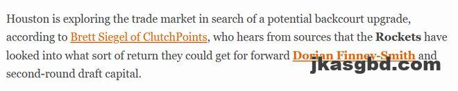 西格尔指出,联盟内部人士透露,火箭队的潜在后场引援目标包括新奥尔良鹈鹕队的何塞-阿尔瓦拉多以及孟菲斯灰熊队的小斯科蒂-皮蓬。此外,芝加哥公牛队的科比-怀特与阿约-多森姆也在火箭的考察范围内,不过想要得到这两位球员,仅靠芬尼-史密斯与次轮选秀权的筹码远远不够。