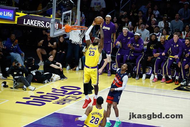 湖人队的勒布朗上半场得到14分、4个篮板和6次助攻,里夫斯得到11分和9次助攻,艾顿得到10分和4个篮板;奇才队的武科切维奇得到9分。