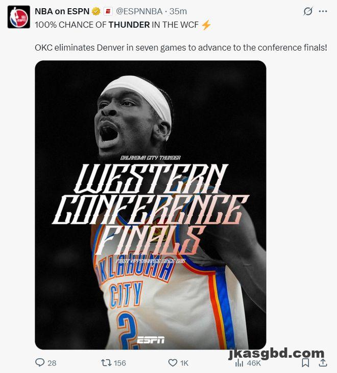 NBA on ESPN官方写道:在分区决赛中有100%的概率发生雷电风暴,因为OKC晋级了西决。