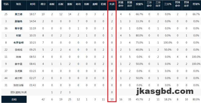 辽宁:布罗金顿23分1板3助2帽、赵继伟11分1板11助2断、莫兰德10分16板2助4帽、付豪10分3板2助、姜宇星9分2板、鄢手骐7分。