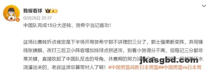 《半岛都市报》、青岛男篮随队记者杜金城赛后也表示,中国男篮这场比赛之所以能逆转,贺希宁、赵继伟两人居功厥伟,这两人就是首功。