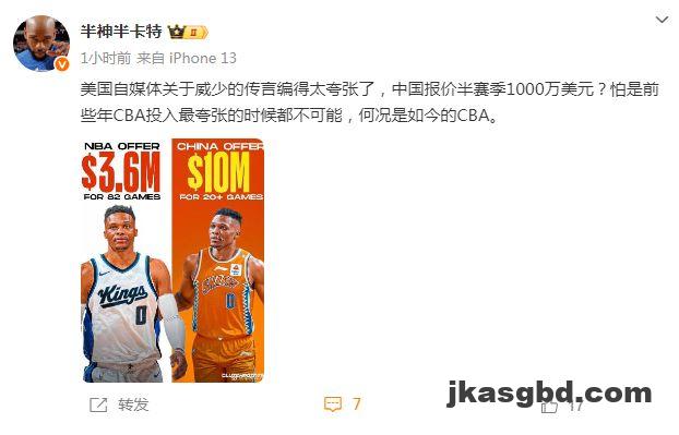 针对如此谣言,国内媒体人半神半卡特发声表示:“美国自媒体关于威少的传言,编得太夸张了,中国报价半赛季1000万美元?怕是前些年CBA投入最夸张的时候都不可能,何况是如今的CBA。”