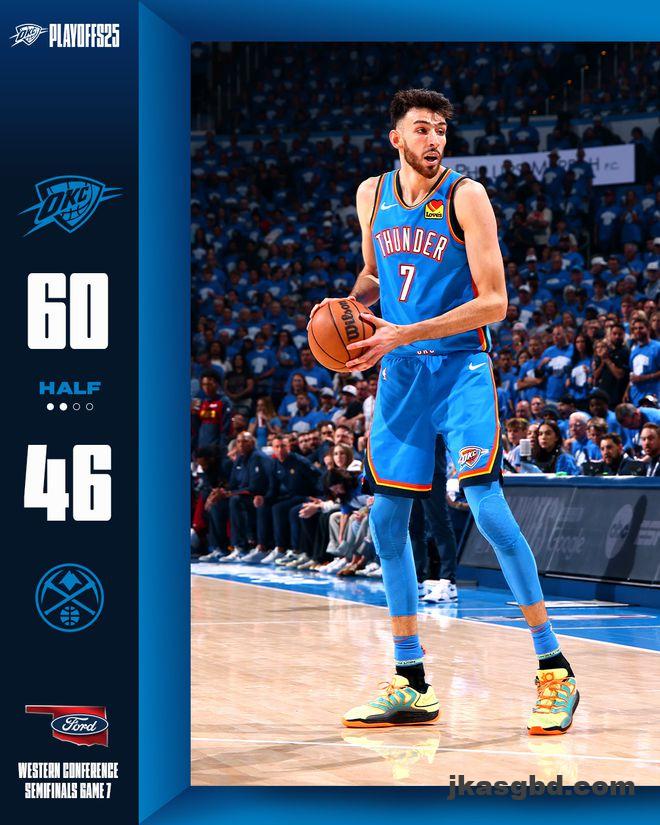 雷霆队的亚历山大得到35分和4次助攻,威廉姆斯得到24分、5个篮板和7次助攻,霍姆格伦得到13分和11个篮板,卡鲁索得到11分,哈滕施泰因得到10分和7个篮板。掘金队的约基奇得到20分、9个篮板和7次助攻,布劳恩得到19分和4个篮板,穆雷得到13分,戈登得到8分和11个篮板。
