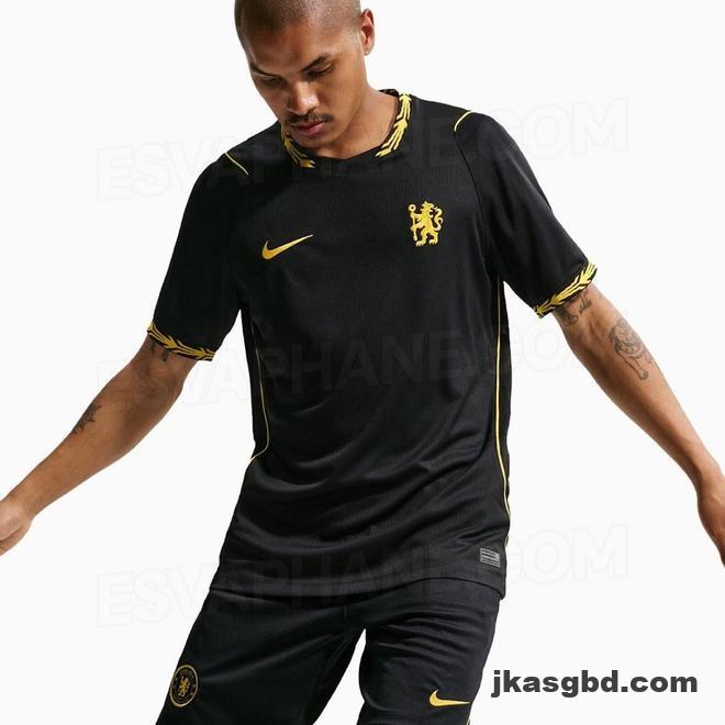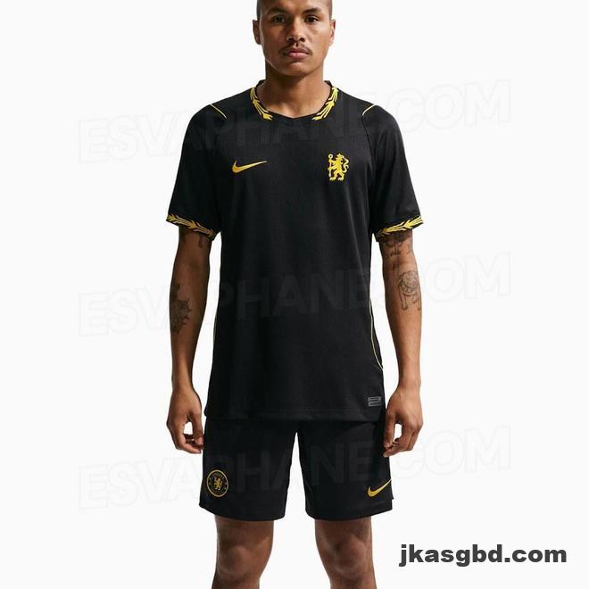 此外,球衣上取代标准的完整切尔西徽章的是简化后的狮子队徽,采用同样的黑金配色。切尔西上一次使用这个简化的狮子标志,还是最近在他们2024-25赛季的第三球衣上。 短裤同样为黑色,与球衣整体风格保持统一。