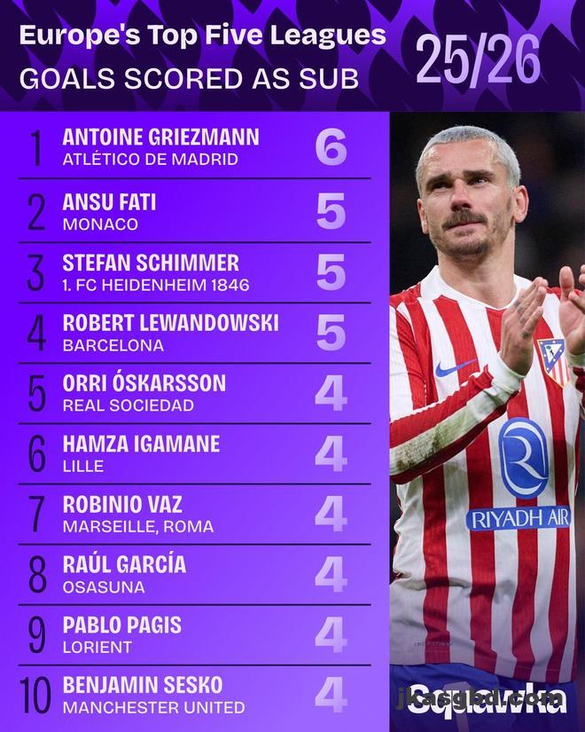 据统计,马德里竞技前锋格列兹曼是本赛季欧洲五大联赛作为替补取得进球最多的球员。