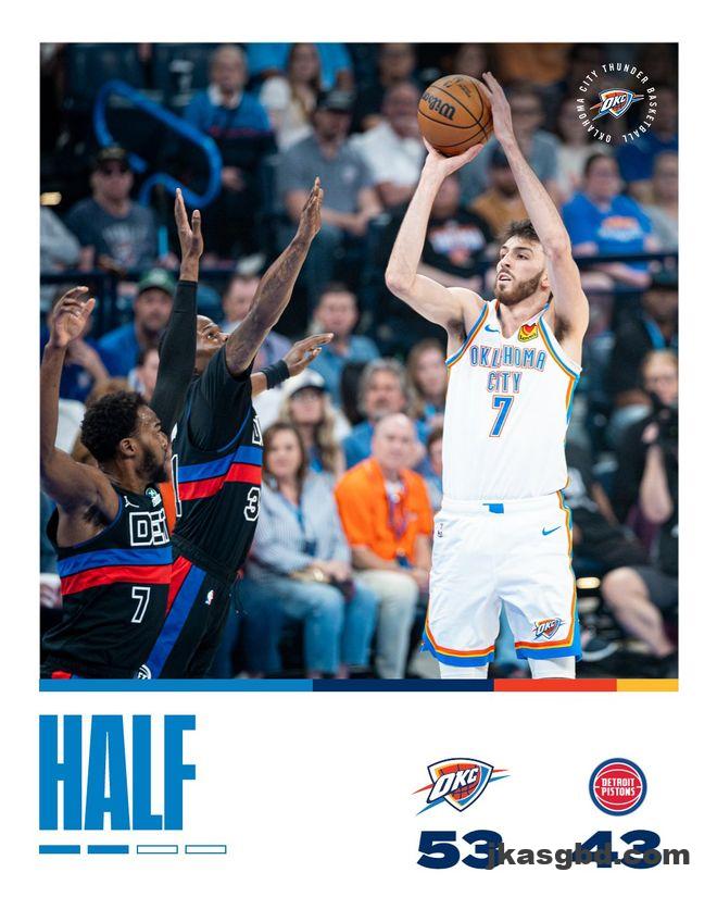 雷霆队的亚历山大上半场得到16分,霍姆格伦得到13分和5个篮板,米切尔得到10分;活塞队的格林得到10分和4个篮板。