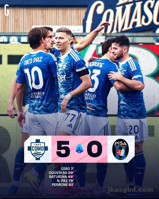仅仅过了7分钟,库恩助攻佩罗内锦上添花,最终科莫5-0血洗对手。