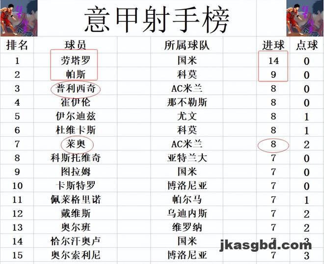 射手榜方面,劳塔罗14球领跑,帕斯9球位列第2。普利西奇,莱奥今天都没有进球,还是和霍伊伦,伊尔迪兹,杜维卡斯8球并列第3。图拉姆,佩莱格里诺,戴维斯等人7球刚好挤入前十。