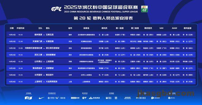 北京国安和保级球队青岛海牛的对决,则由马宁主哨,万涛作为VAR裁判进行辅佐。其他涉及争冠的比赛,上海申花主场和大连英博的比赛,由顾春含执法,王竞作为VAR裁判辅佐,成都蓉城做客和青岛西海岸的比赛,李海新担任主裁。